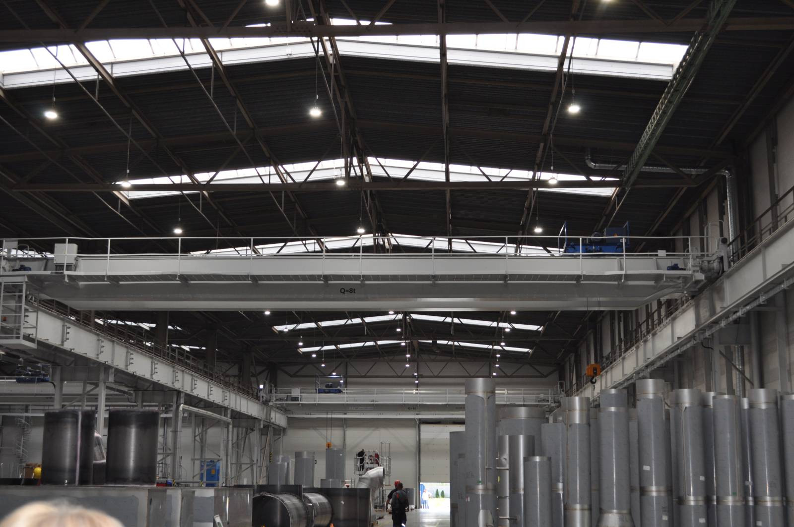 Hala dwunawowa rok 2023: wymiana świetlików dachowych, wymiana oświetlenia, nowa bezpyłowa posadzka, wymiana bram, czyszczenie i malowanie konstrukcji hali, nowe poszycie hali z płyty warstwowej gr 12 cm, gruntowna modernizacja wszystkich czterech suwnic (Q=8t – 3szt, Q=5t – 1szt) wraz z malowaniem, nowa instalacja elektryczna wraz z rozdzielniami.