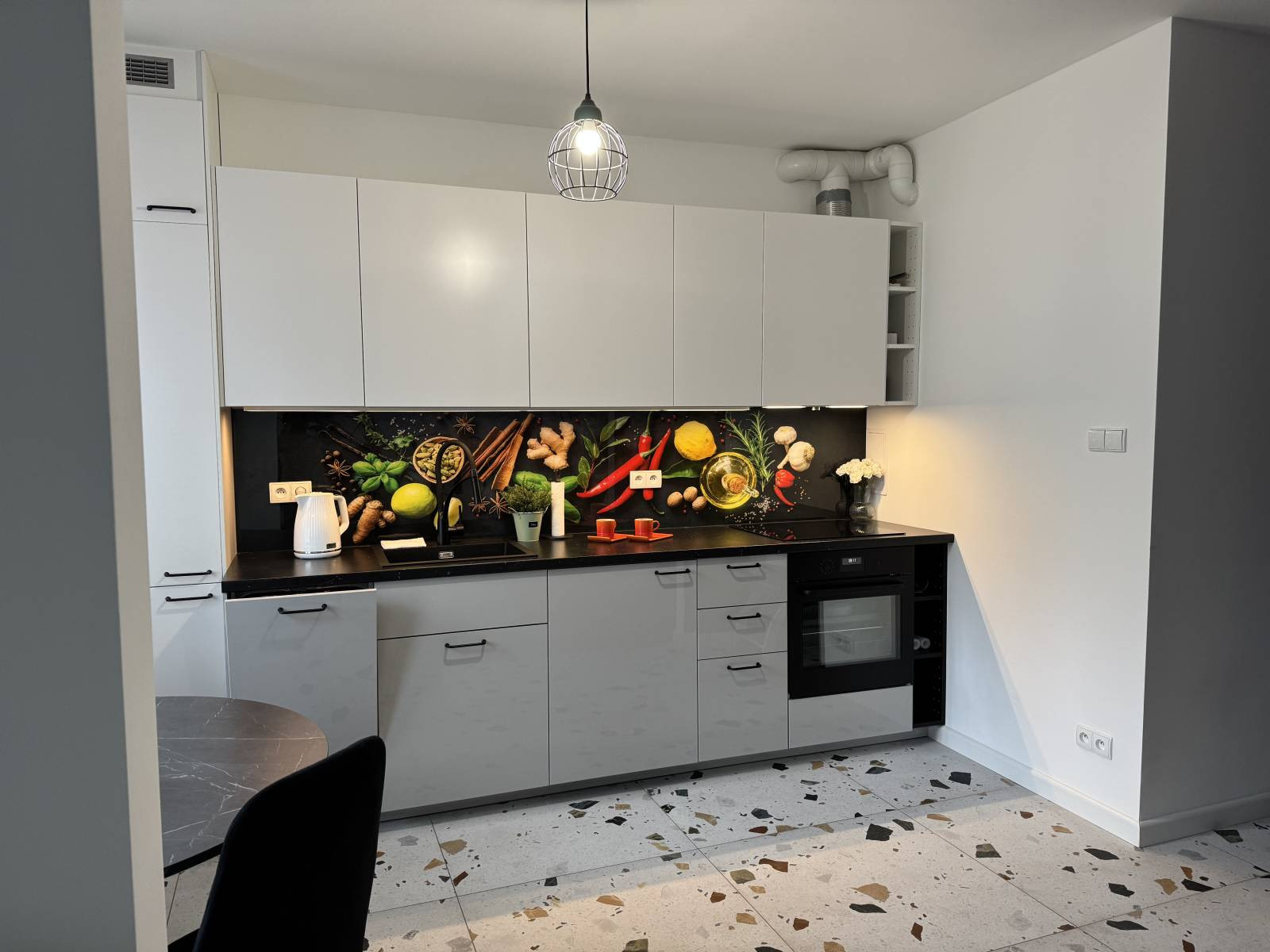 • otwarta nowoczesna kuchnia (w pełni wyposażona we wszystkie urządzenia: lodówka, kuchenka indukcja, piekarnik, zmywarka oraz pralka w zabudowie ),