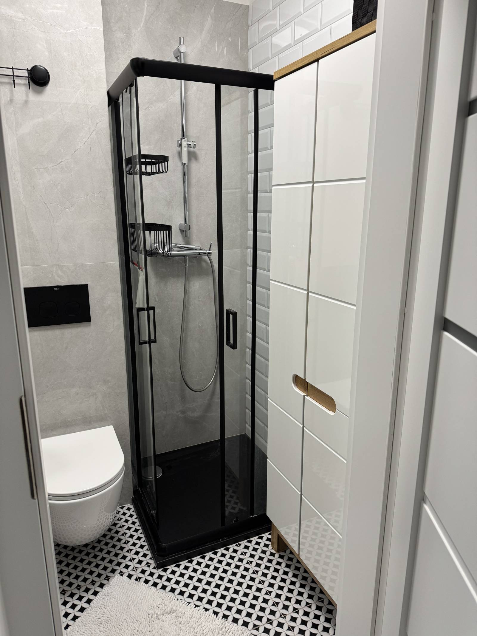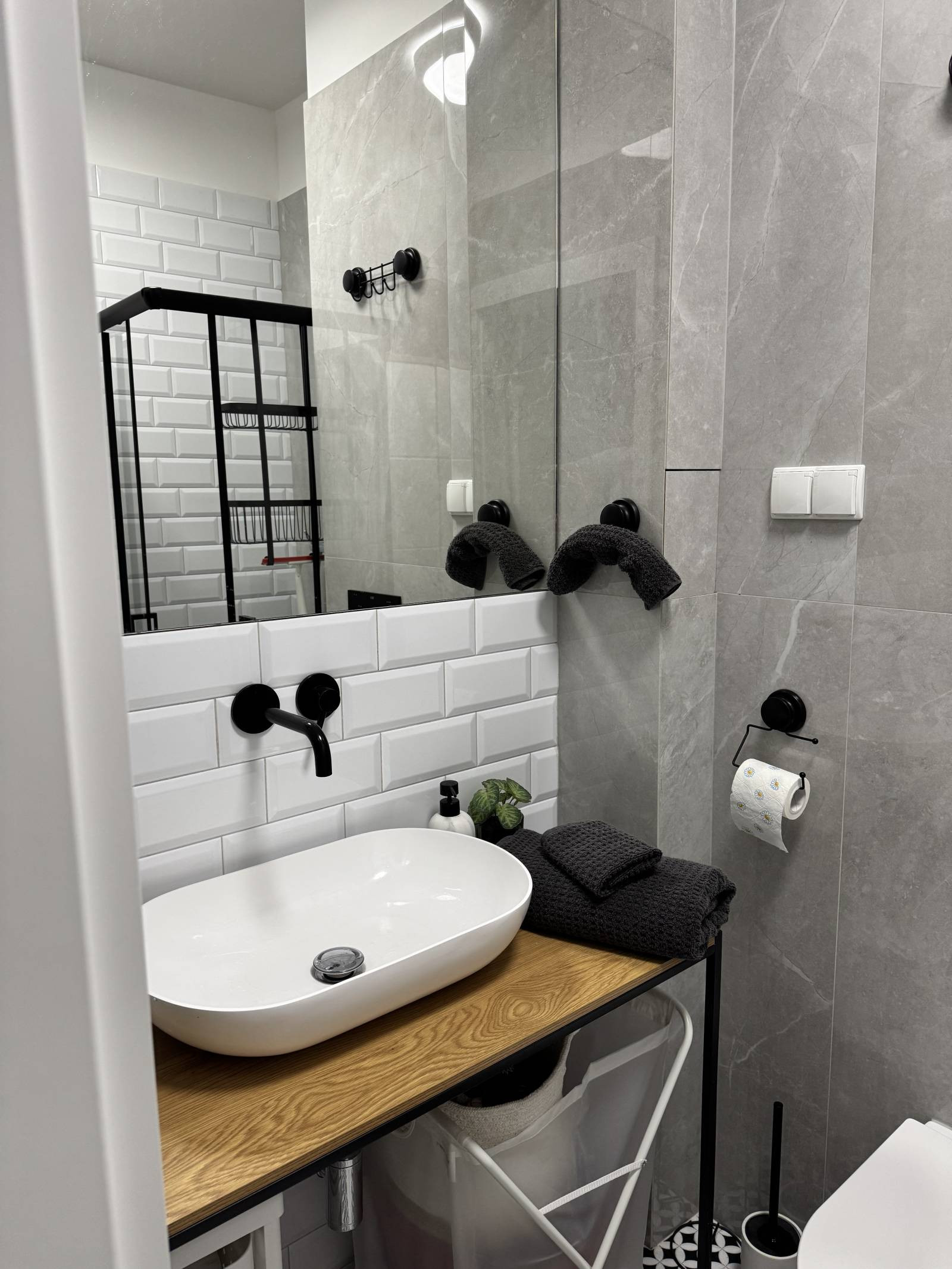 • łazienka z umywalką, kabiną prysznicową, toaletą i szafką (wystrój loftowy: biel / czerń, drewno)
