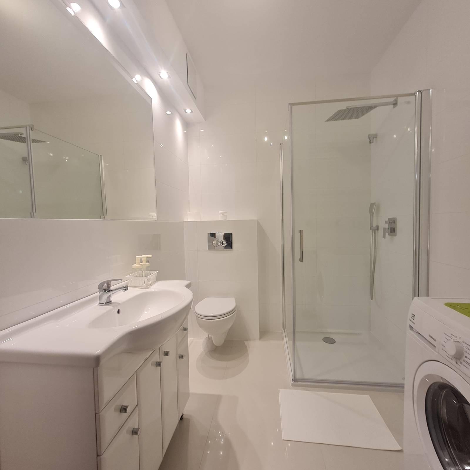 Łazienka z kabiną prysznicową, umywalką, szafką, dużym lustrem i pralką.