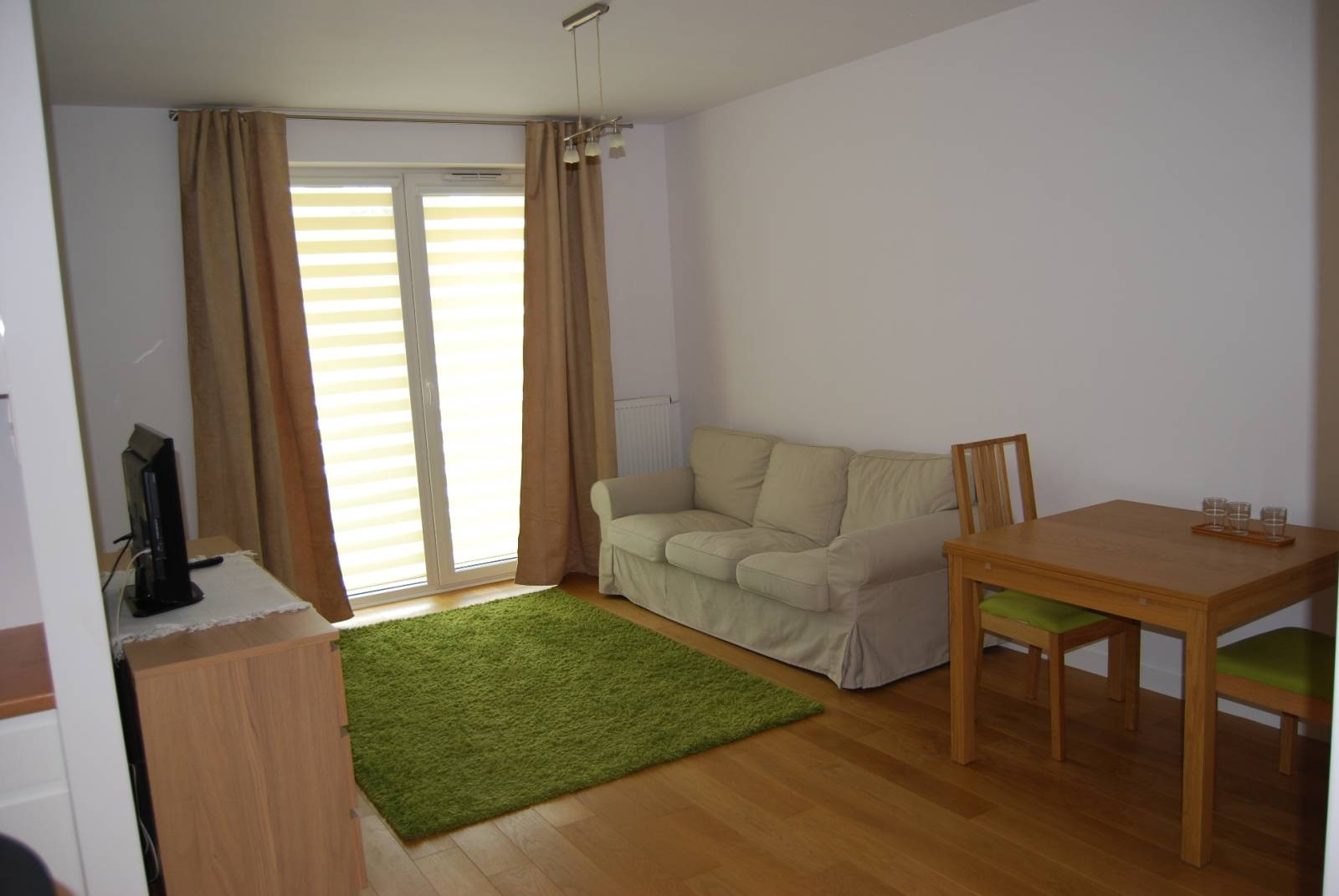 Duży salon umeblowany w wygodną kanapę, komodę oraz stół z krzesłami. W pomieszczeniu jest dużo światła dzięki dużym przeszklonym drzwiom przez które jest wyjście na balkon.