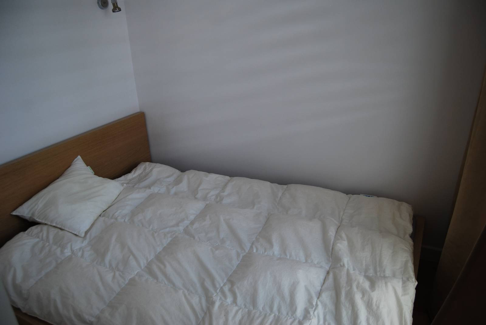 W sypialni duże łóżko (140x200) z bardzo wygodnym materacem i podręczna szafka.