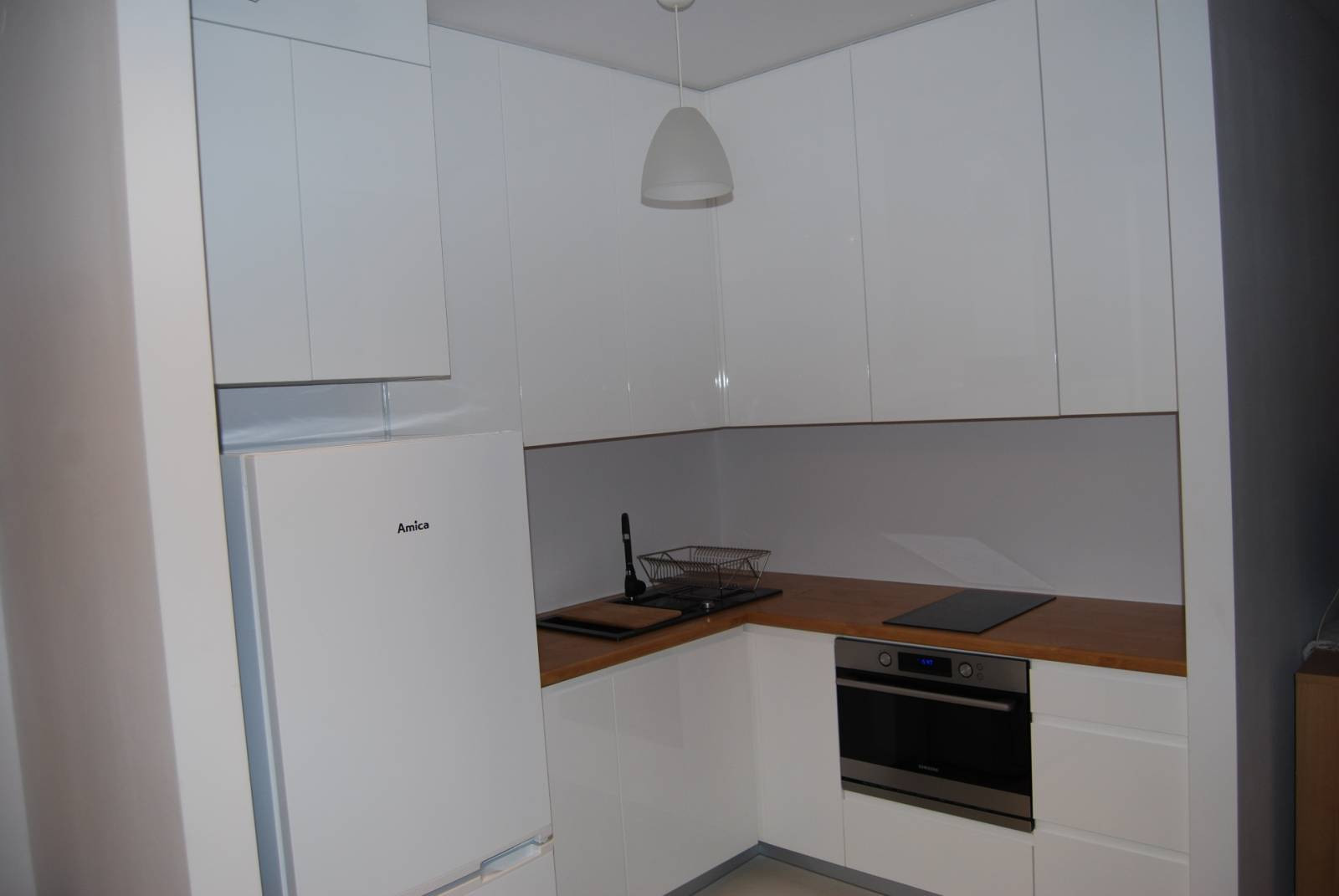 Kuchnia wyposażona w meble w zabudowie oraz sprzęt AGD - płyta ceramiczna, piekarnik z funkcją mikrofali, zmywarka i lodówka.