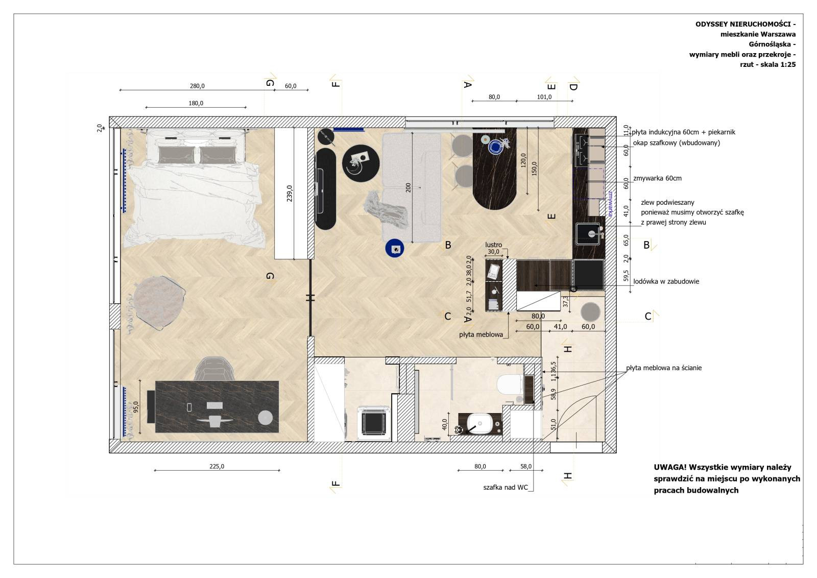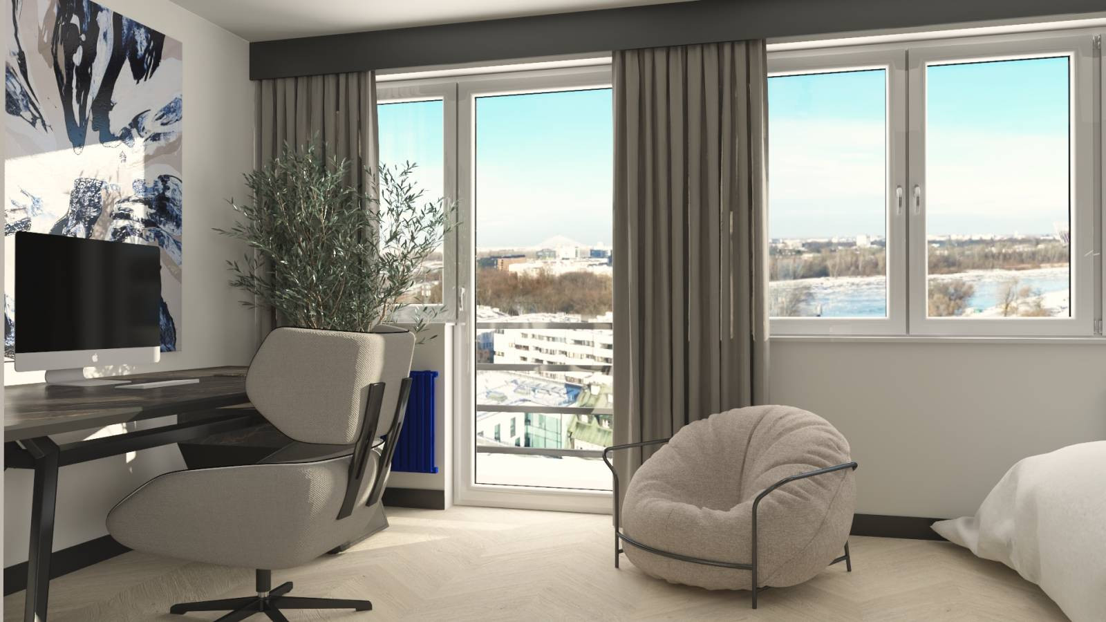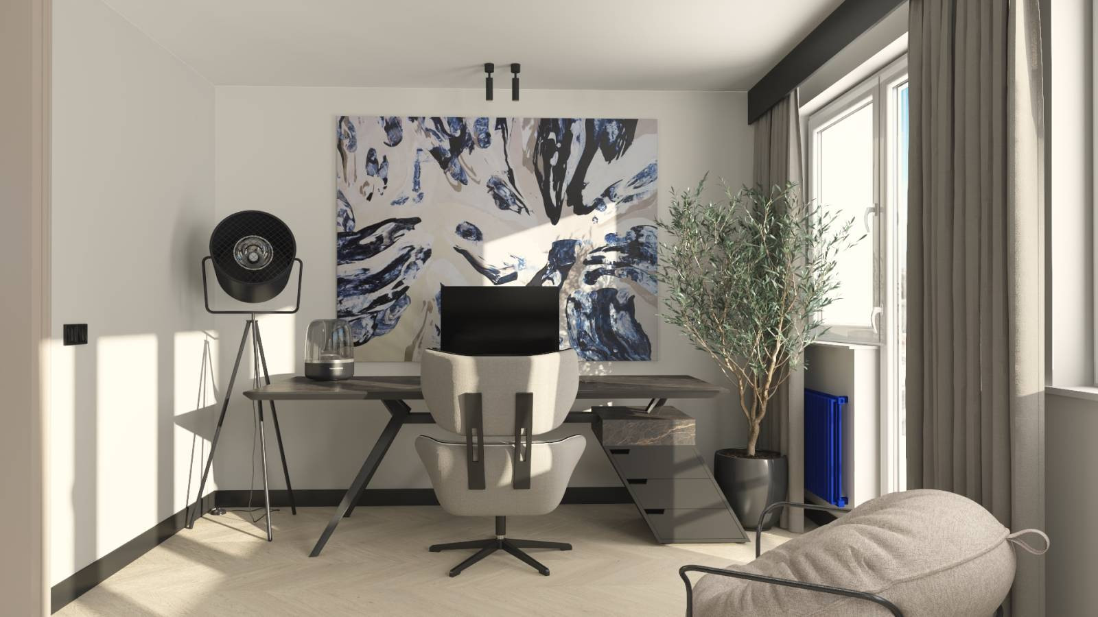 pomieszczenia: 2 pokoje (salon z aneksem kuchenny + sypialnia z biurem) + garderoba + łazienka