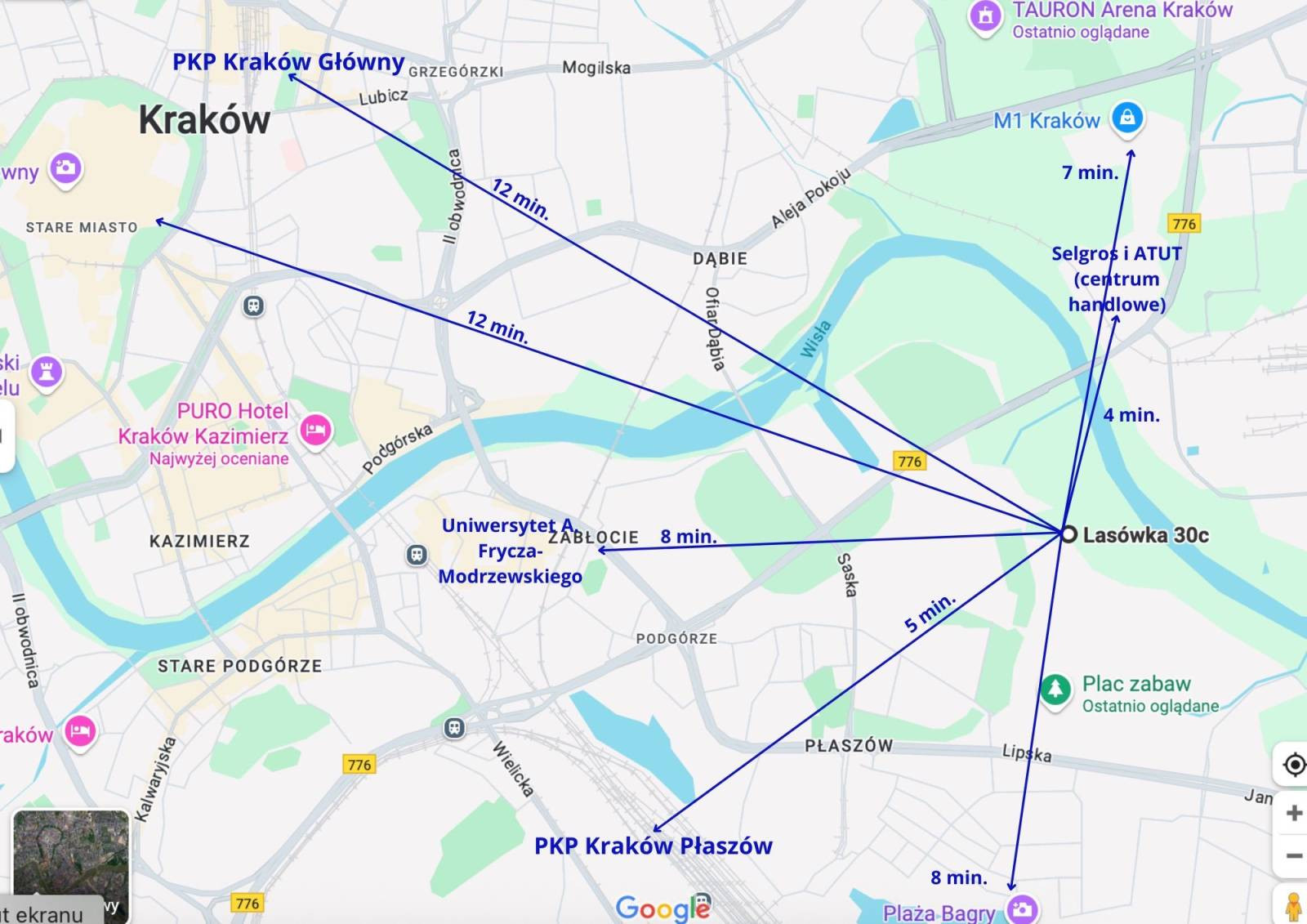 Tuż pod domem znajduje się przystanek autobusowy (1 min.) z bezpośrednim połączeniem m. in. na Dworzec Czyżyny. W perspektywie najbliższych paru lat rozbudowa infrastruktury komunikacyjnej (trasy Ciepłownicza i Nowobagrowa).