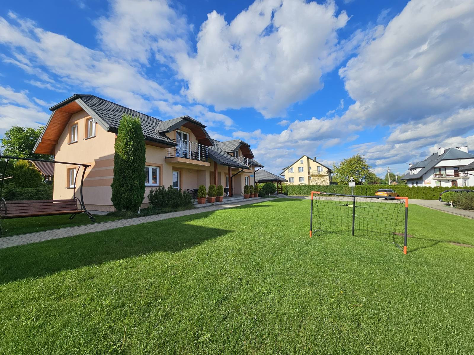 Teren w 63% biologicznie czynny, z placem zabaw, wiatą grillową i parkingiem